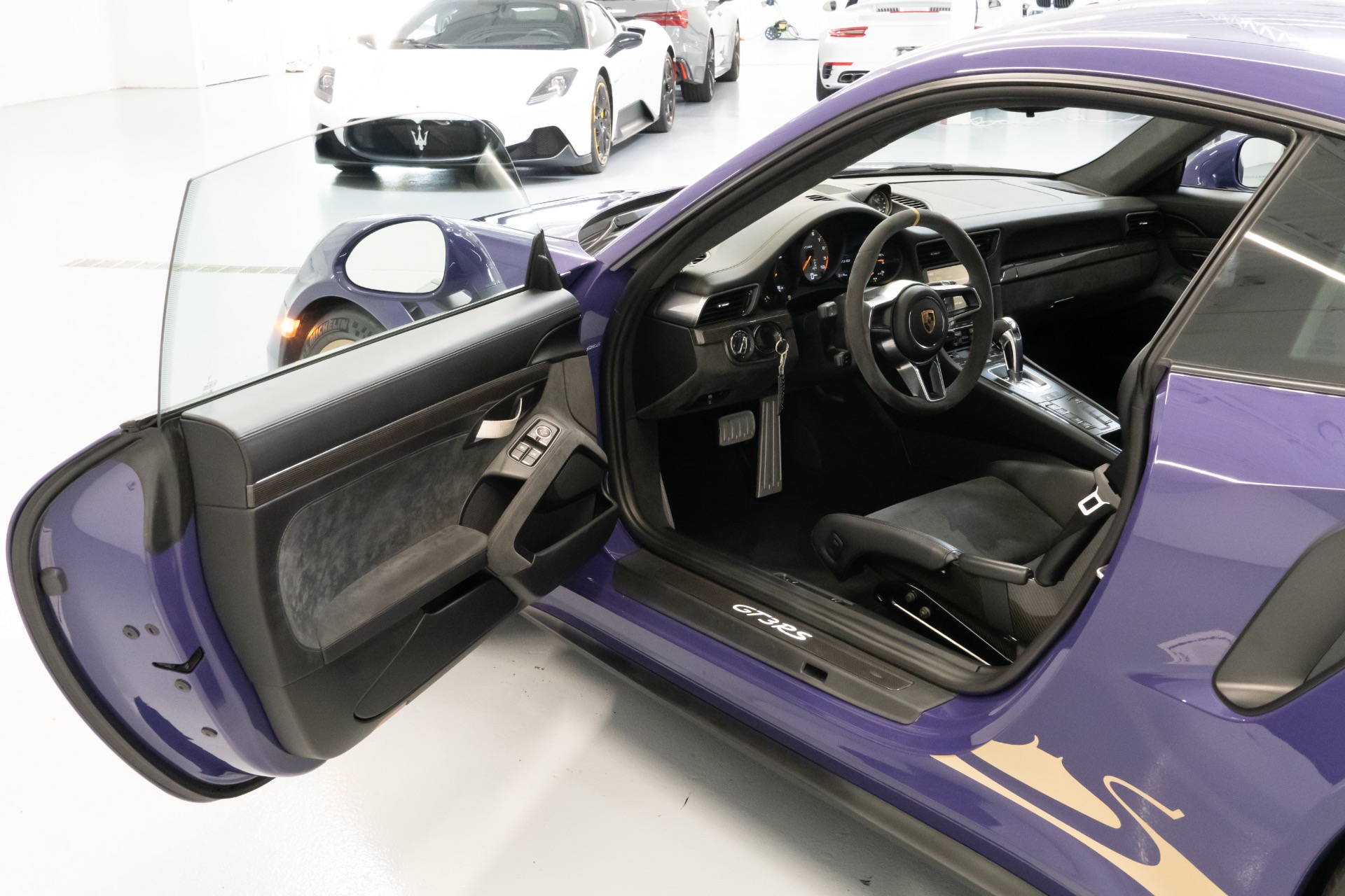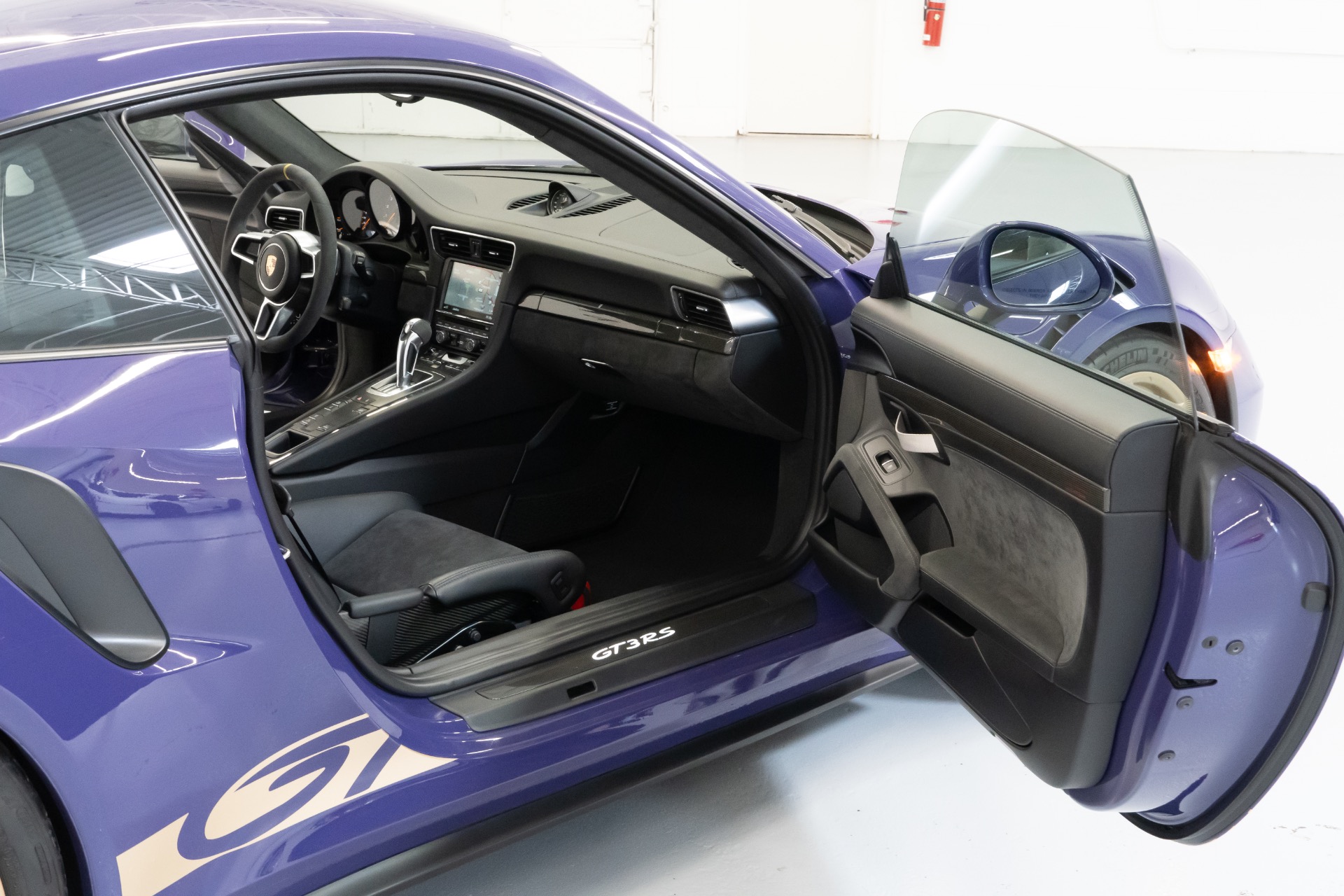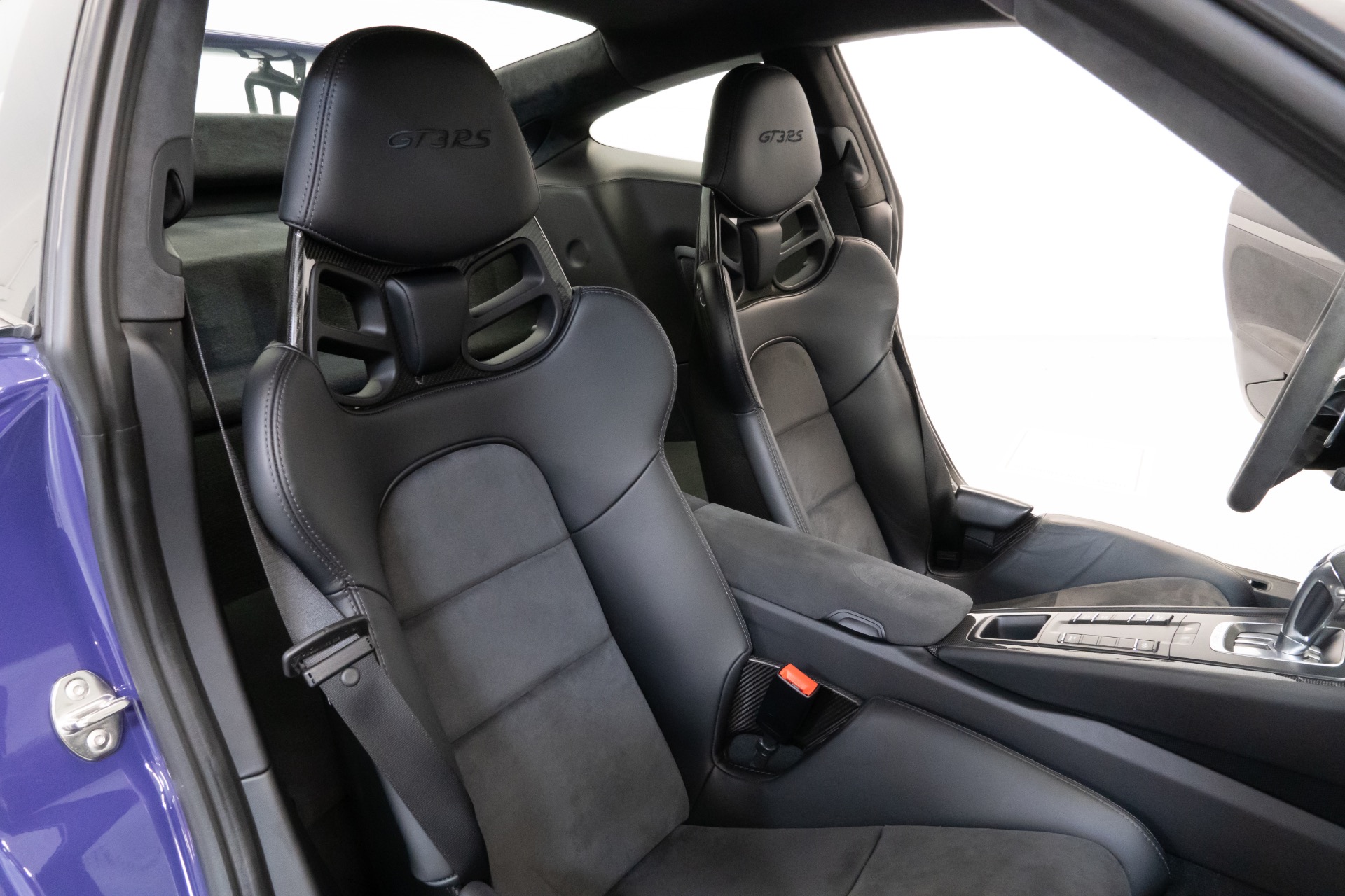 The exterior of this Porsche 911 GT3RS is finished in the striking Ultraviolet paint, an attention-commanding hue that accentuates the car's aggressive lines and aerodynamic design. Complementing the exterior is the exquisite Black/GT Silver leather interior with Alcantara inserts, a luxurious and sporty combination that envelopes the driver and passenger in pure comfort.